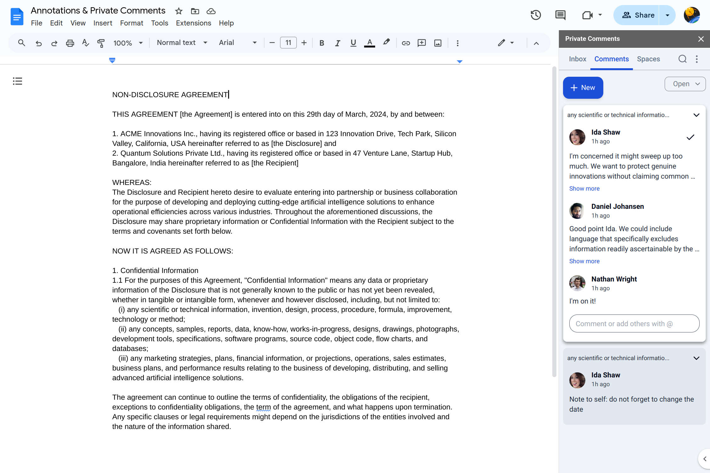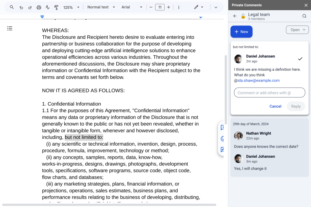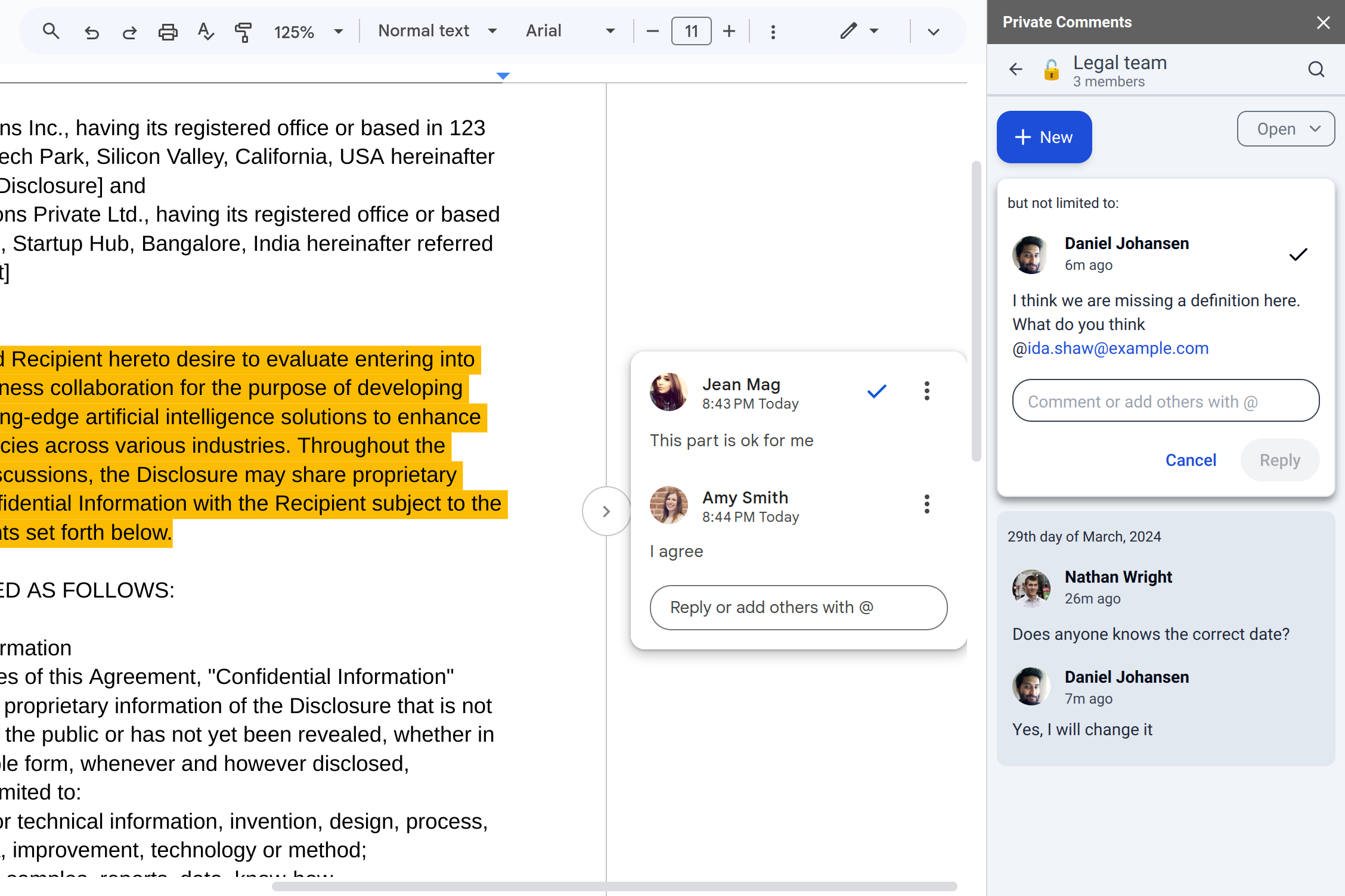 Have dynamic discussions evolve alongside your document. Private Comments facilitates instant communication, allowing you to address questions and concerns as they arise.